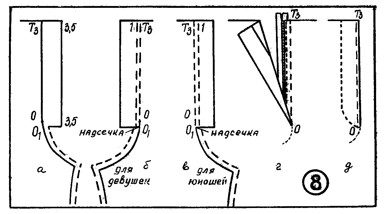 брюк, для юношей — на правой (рис. 8б и 8в).